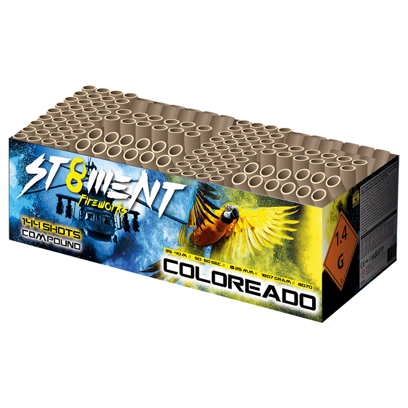 Coloreado is Spaans voor gekleurde, en gekleurd is deze compound zeker. Super heldere blinkers in rood, groen, geel, goud en zilver glitteren in de lucht. Afgewisseld met diverse schietrichtingen en spectaculaire spinning tails een topper bestaande uit maar liefst 144 schoten!